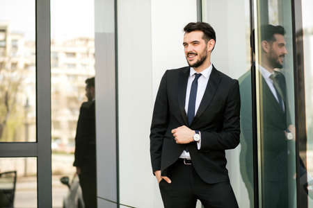 confident elegant man standing outside next to an office building and smiling to side