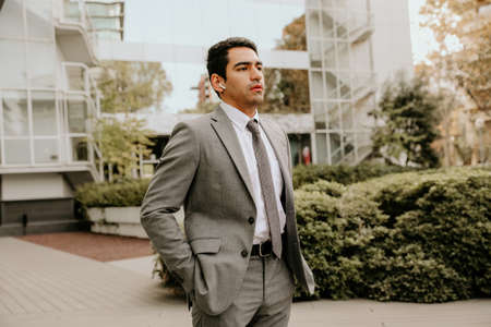 Portrait of a young businessman wears elegant tailored suit. Walking outdoor.