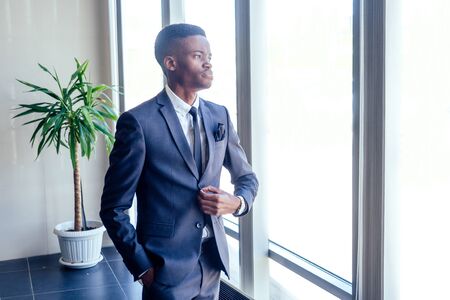 Handsome cheerful african american in a modern office with a panoramic window