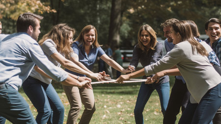 Under a large banner that reads 'STRONGER TOGETHER,' a diverse group of young adults laughs and strains in a spirited game of tug-of-war. The image is a vibrant symbol of community, teamwork, unity, and collective strength.