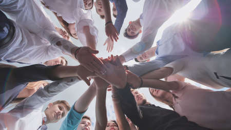 Friendly friends join hands as a sign of joint business. The concept of team and community.