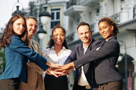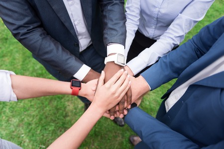 We are the one. Top view of hands of pleasant colleagues keeping them together while standing on the grass