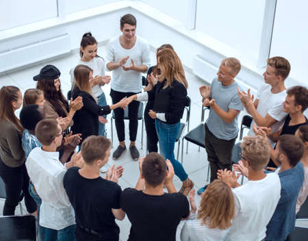 Young womans work being greatly appreciated. Group of happy cheerful positive respectful employees sitting in circle at office meeting, smiling and applauding their team leader. Recognition concept