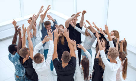 School class collection. The pupils wave their hands and run. College Students Teamwork Stacking Hand Concept. Nineteen friends.