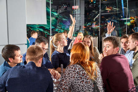 Kirov, Russia - September 25, 2019: People at table in small cafe or restaurant during intellectual game. Hungry group waiting for the waiter to get the menu or food