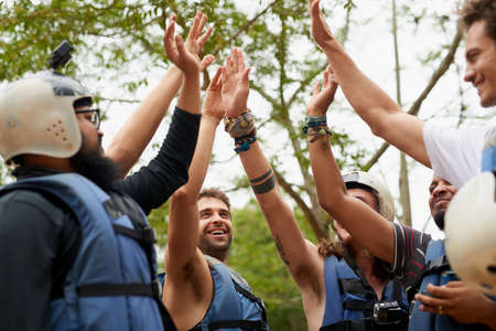 This is for being an adventurer seeker. a group of young male friends giving each other a high five before they go white water rafting.