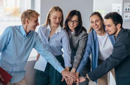Young business people Teamwork Stacking Hand Concept. Close up of young business people putting their hands together. Friendly business people with stack of hands showing unity and teamwork.