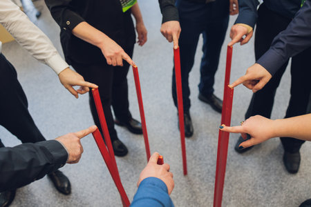 Vertical team building is an exercise for people with common interests in the company. Close-up of hands holding one stick