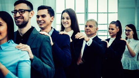 A positive and friendly office leadership development game. Team building. Coaching from a coach. Mentoring. A group of people holding hands