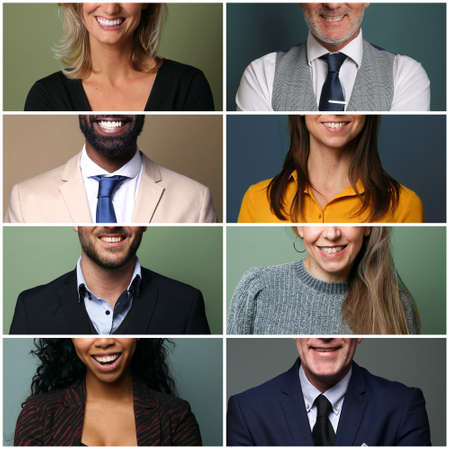 Collage of portraits of an ethnically diverse and mixed age group of focused business professionals