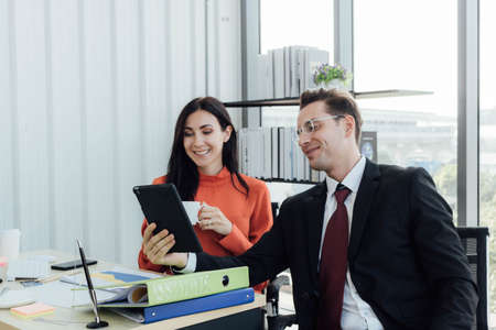 Caucasian business partners researching on digital tablet for designs of new logo for company sitting in open office