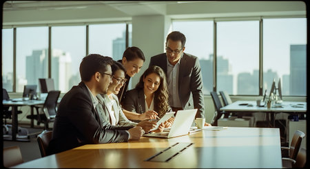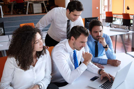 Group of business people working together in modern office. Multiethnic group of business people using laptop computer.