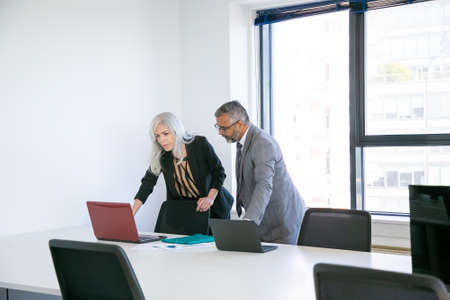 Couple of business colleagues or partners starting meeting in conference room, standing at table and using laptop together. Wide shot. Business communication concept