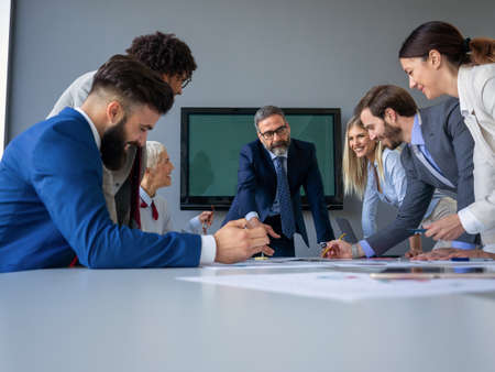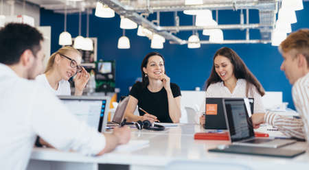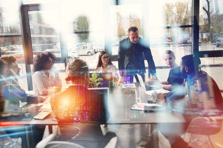 Successful team. Group of young multi-ethnic business people working and communicating together in creative office. Selective focus