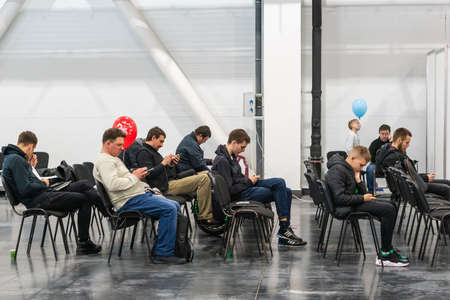 Kyiv, Ukraine, February 28, 2020: a group of men are sitting in the hall on chairs and watching something on their smartphones.