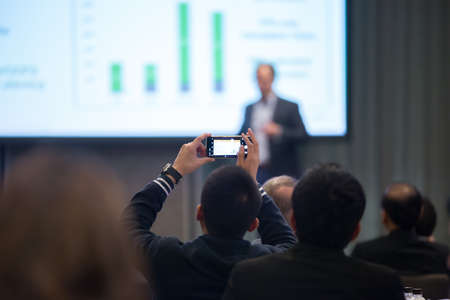 Person take photo on phone in crowded audience business forum. Conference business man with mobile. Seminar for viewer auditorium. group people listen speaker speech. Taking photography scene on phone