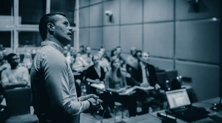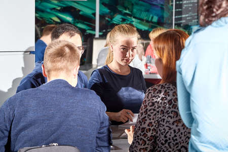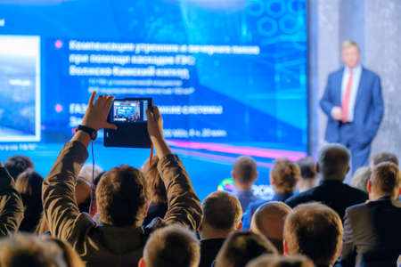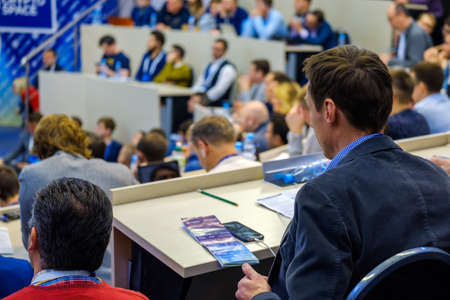 Moscow, Russia - April 19, 2018: Audience listens lecturer at workshop in conference hall