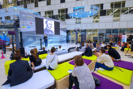 Skolokovo, Russia - October 16, 2017: People attend Open Innovations 2017 forum in new building Skolkovo Technopark.