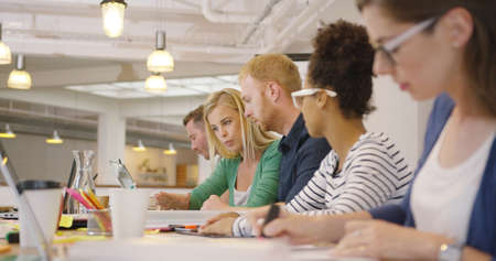Diverse people posing in row at table on background of modern office and working all together with various documents.
