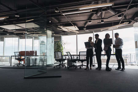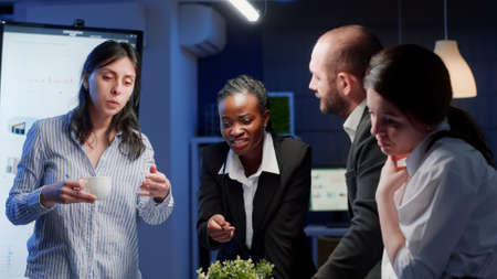 Diverse teamwork brainstorming corporate ideas checking company graphs statistics using laptop standing at conference table. Multi ethnic teamwork working at business presentation in meeting room