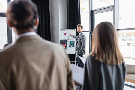 businessman pointing at flip chart with graphs near blurred interracial colleagues