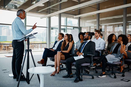 He has years of experience to draw from. Full length shot of a handsome mature businessman giving a presentation in the conference room.