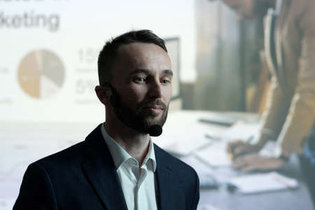 Young serious business coach presenting company profit information while standing against interactive board with diagram