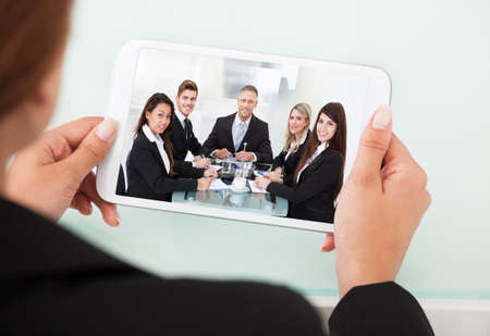 Cropped image of businesswoman video conferencing with team on digital tablet at desk in office