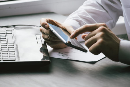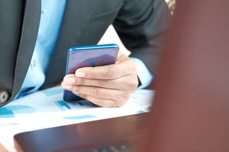 Close up image of businessman using smart phone and laptop with selective focus, freelance internet online business concept