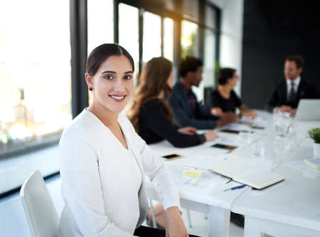 Our strategies for success are all in place. Portrait of a businesswoman sitting in a boardroom meeting with colleagues in the background.