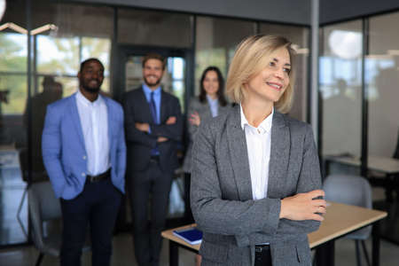 Business team standing in front of the meeting room. Successful company with happy in workers.
