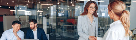 Business woman with her staff, people group in background at modern bright office indoors