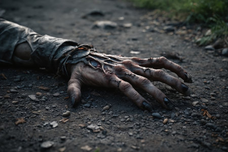 Creepy image of a detached hand on a dark, deserted road, evoking fear and suspense.