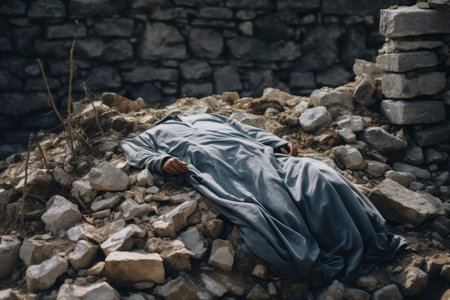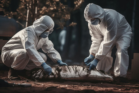 Criminologist in white protective gloves wears face masks works with dead body at crime. AI generated illustration