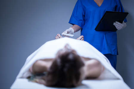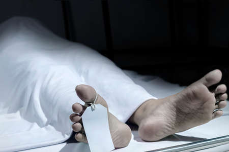 Human corpse covered with a sheet and name tag on toe in the morgue