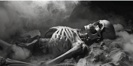 skeletons and horror enthusiasts alike will love this graphic featuring a highly-detailed zbrush-style skeleton. the shallow depth of field adds an eerie touch to the already haunting image, while the dark cyan and gray color scheme sets the mood for a spooky scene. shot with a zeiss batis 18mm f28 lens, the heavily textured image is perfect for fans of zombiecore and supernatural creatures. get