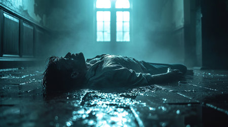 Horror evil woman ghost creepy lying dead in a dark room at house. Female zombie in blood devil is scary she haunted at the abandoned building, Happy Halloween festival day concept