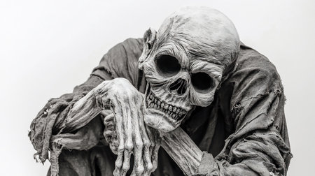 Ghoulish and eerie masculine creature with gouged eyes that resemble a skull
