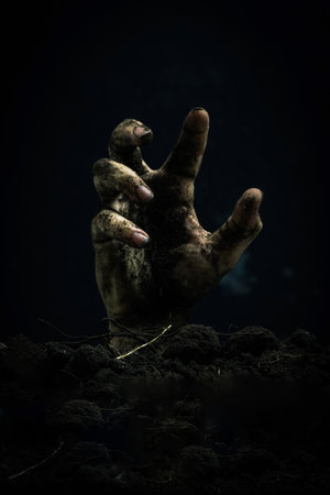 Creepy zombie hand on dark background with copy space. Halloween concept
