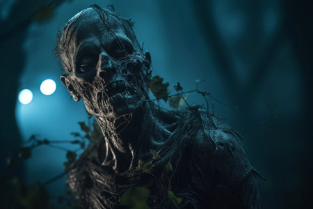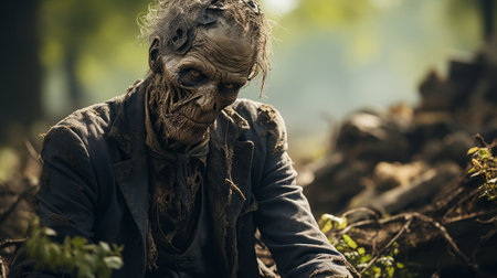 Creepy disfigured zombie in macabre forest. Mutilated sinister grisly dead walking cadaver. Generate ai