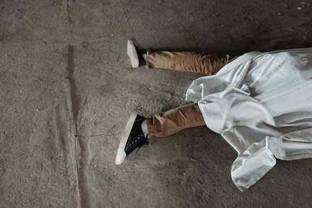 Above view of legs of young man shot dead lying on asphalt in parking area or in the street during crime scene investigation measures