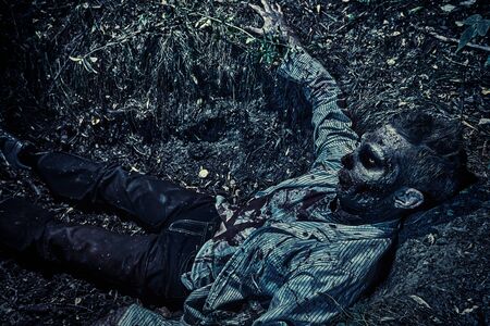 Zombie male crawling on floor halloween concept. Make up skin and blood face