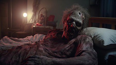 the zombie game setup in the bedroom showcases a thrilling scene of undead chaos, with scattered game pieces, blood-stained cards, and eerie lighting, evoking a sense of apocalyptic horror, perfect for fans of survival horror games and tabletop gaming enthusiasts. ai generated