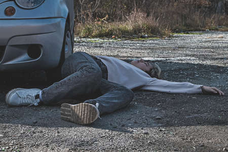 the murdered girl got into an accident under a car on the road there is a dead corpse on the ground.