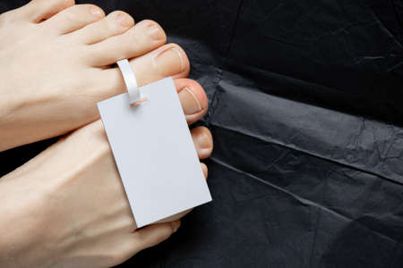 Closeup of foot in a morgue with blank tag hanging from the big toe. Foot clearly shows flaking skin and athlete's foot fungus as well as years of hard use. (body is a model)