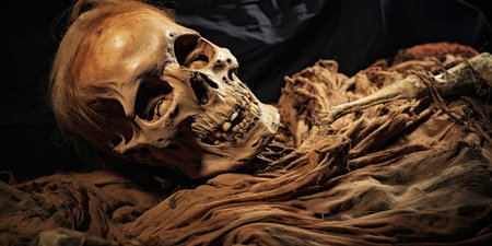 Collection of skulls covered with spider web and dust in the catacombs. Rows of creepy skulls in the dark. Abstract concept symbolizing death, terror, and evil.
