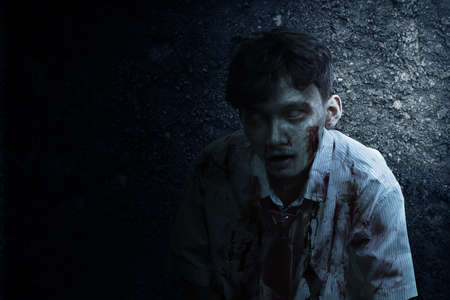 Scary zombie with blood and wound on his body standing with grunge wall background