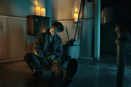 Zombie male creeps on floor halloween concept. Make up skin and blood face
