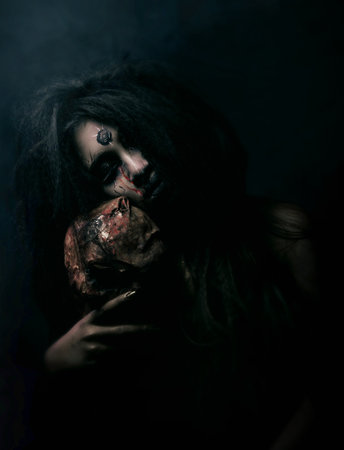 Close-up portrait of a horrible scary zombie woman.