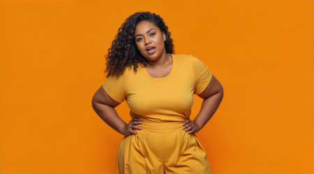 Fashionable curvy woman wearing matching yellow ensemble strikes confident pose against bright orange background, showcasing body-positive attitude and contemporary plus-size style.
